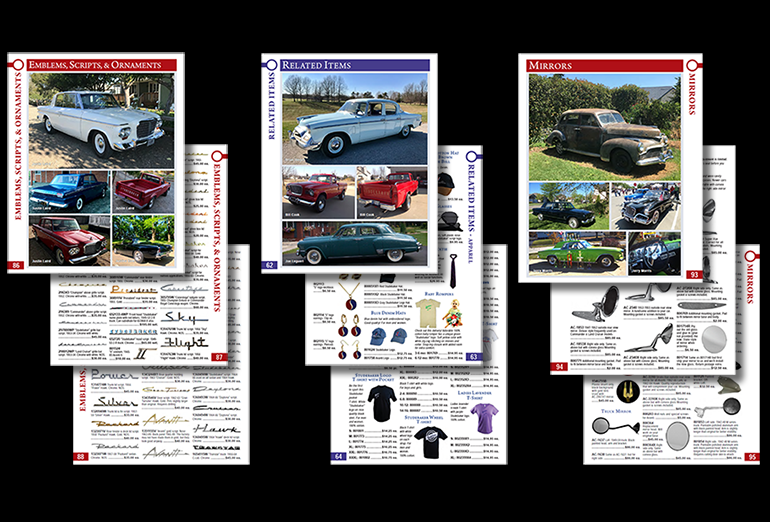 Here are some samples from the Studebaker Catalog that sadly never came to completion due to budget constraints. It was a massive under-taking by myself and another graphic artist. Starting from scratch, we organized, categorized, and photographed many parts found through-out. Despite it not being a fully completed project, I wanted to include it as this is where much of my time went. I am including a link for those curious to view it. It contains almost 500 pages and lists over 10,000 parts. Click here to view catalog.